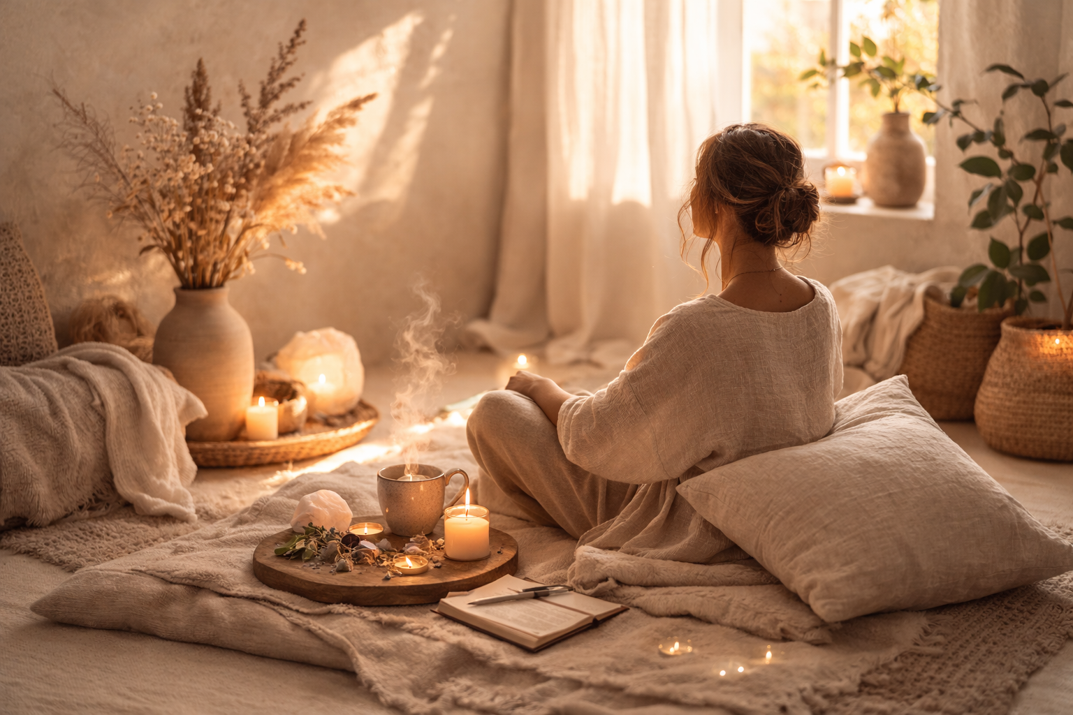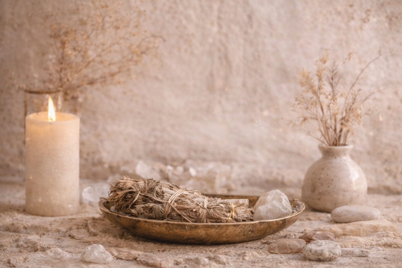 Ritual elements: Cleansing smoke, soft sound vibration, warm herbal scents, grounding crystals.